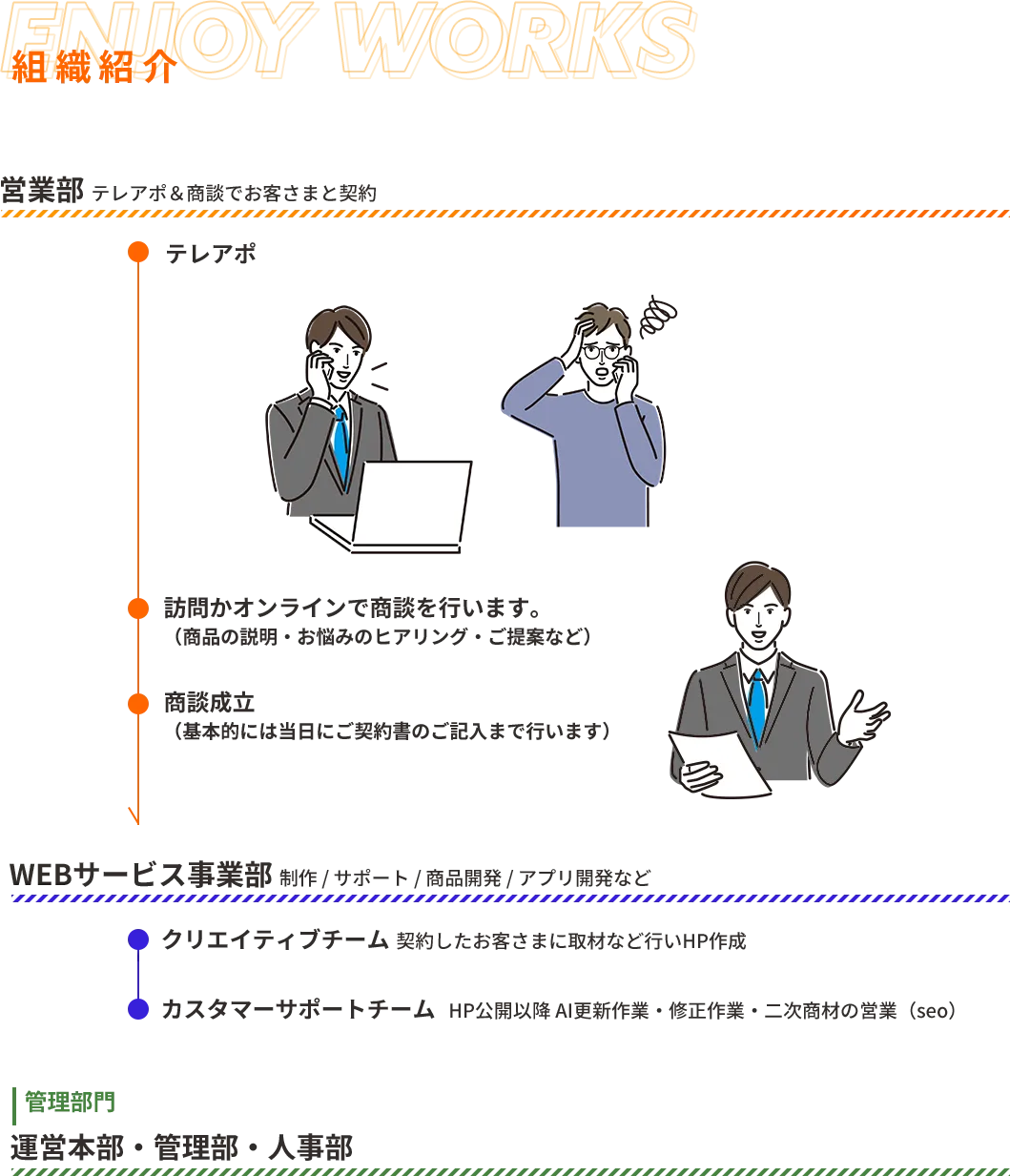 | 業務案内 | お客様のお悩みをITの力で解決 建設業の経営者と商談 課題やニーズをヒアリング ▼ ▼ ニーズに合わせたピッタリのHP・SNS動画を提案 \POINT/ 建設ラッシュの影響で効率的な 現場管理ができずに悩む企業へ 自社で開発したAI搭載のWEBシステムを提案! HPという側面から事業をサポートします。 **未経験もOK!経験者にも選ばれる環境で理想のワークスタイルを実現** 先輩の90%以上が未経験スタート! アパレルや飲食店出身など異業種の先輩も。 「何かチャレンジしてみたい」 「自信を持って自社の商品を提案したい」 「しっかりと稼ぎたい」 「頑張った分は評価されたい」 「自分の市場価値を高めたい」 と、前向きに取り組むあなたを応援します! 当社では先輩社員の90%以上が未経験スタート。 第二新卒の方はもちろん、初めて正社員にチャレンジしたいという方も大歓迎です! |